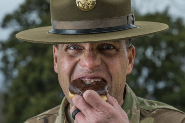 Sgt. 1st Class Joshua Moeller, U.S. Army Reserve drill instructor and the 2016 U.S. Army Noncommissioned Officer of the Year, jokes around by biting into a donut during a marketing photo shoot organized by the Office of the Chief of Army Reserve at Fort Belvoir, Virginia, Feb. 14, to promote the U.S. Army Reserve.