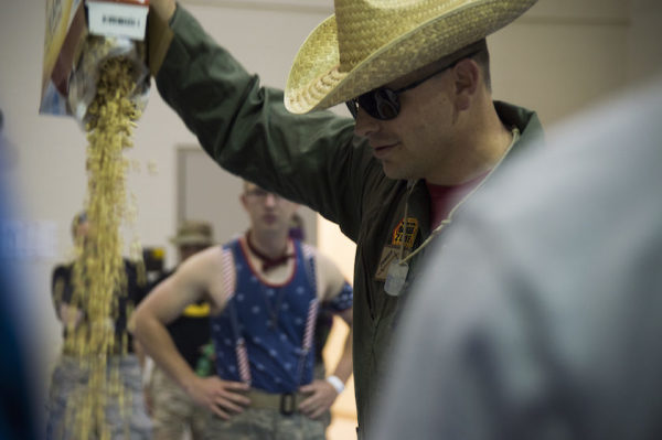 Maj. Rodney Lambert, 50th Contracting Squadron commander, pours breakfast cereal into the grog during the 2016 Combat Dining Out at Schriever Air Force Base, Colorado, Friday, April 15, 2016.