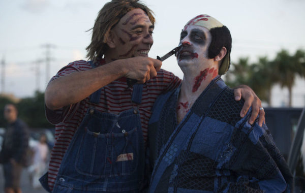 Aaron Marshall (right), a Maryland University professor, interacts with a local Okinawan in the 6th Annual Okinawa Zombie Walk at American Village, Okinawa, Japan, on October 30, 2016.