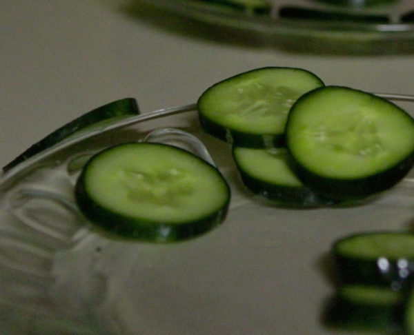 Fresh cucumbers are cut and placed on serving dishes for Afghan National Army soldiers and Sgt. Christopher Scott, a logistics advisor with the Embedded Training Team, 2nd Battalion, 6th Marine Regiment, April 29, 2012.