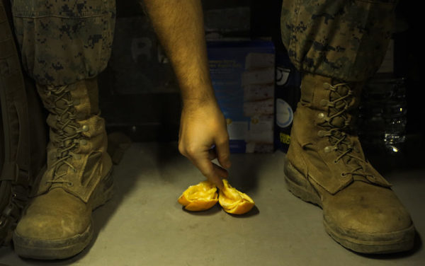 Sgt. Anthony Bradley eats an orange after a training day, May 12, 2016, at Camp Rodriguez Live Fire Complex, South Korea.