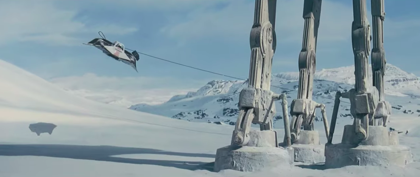 The snow speeders made their debut in the second Star Wars movie to be released, The Empire Strikes Back. The snow speeders help the Rebel Alliance mount a desperate defense against the invading Imperial army on the ice planet Hoth. While the tiny two-person speeders are fast and maneuverable, their twin laser cannons can’t penetrate the thick armor of the four-legged Imperial All Terrain Armored Transports (AT-ATs). Instead, the lead pilot, Luke Skywalker, tells his comrades to shoot the speeder’s rear-facing harpoon at the walkers’ legs, then spin out the attached tow cable as the pilot circles the walker. The cable wraps around the AT-AT’s legs, making the massive walker trip into the snow, delaying the Imperial advance while the rebels evacuate the planet.