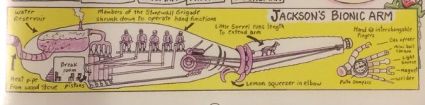 A panel from Mark Cline’s Dinosaur Kingdom II comic book, and yes those are tiny Confederate soldiers, and a horse, inside Stonewall Jackson’s bionic arm.