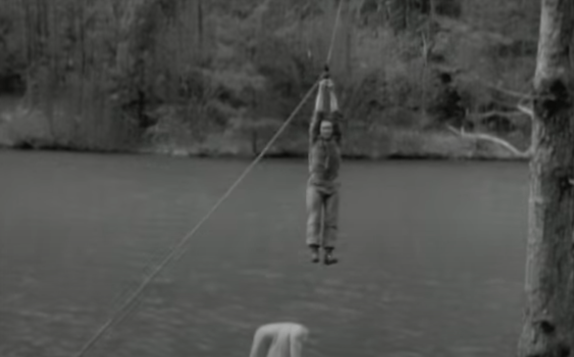Then it’s time for some mountain training at the Ranger camp in the mountains outside of Dahlonega, Georgia. “Here, man’s best friend is the rope,” we hear, “and Ranger students learn to make good use of it.”