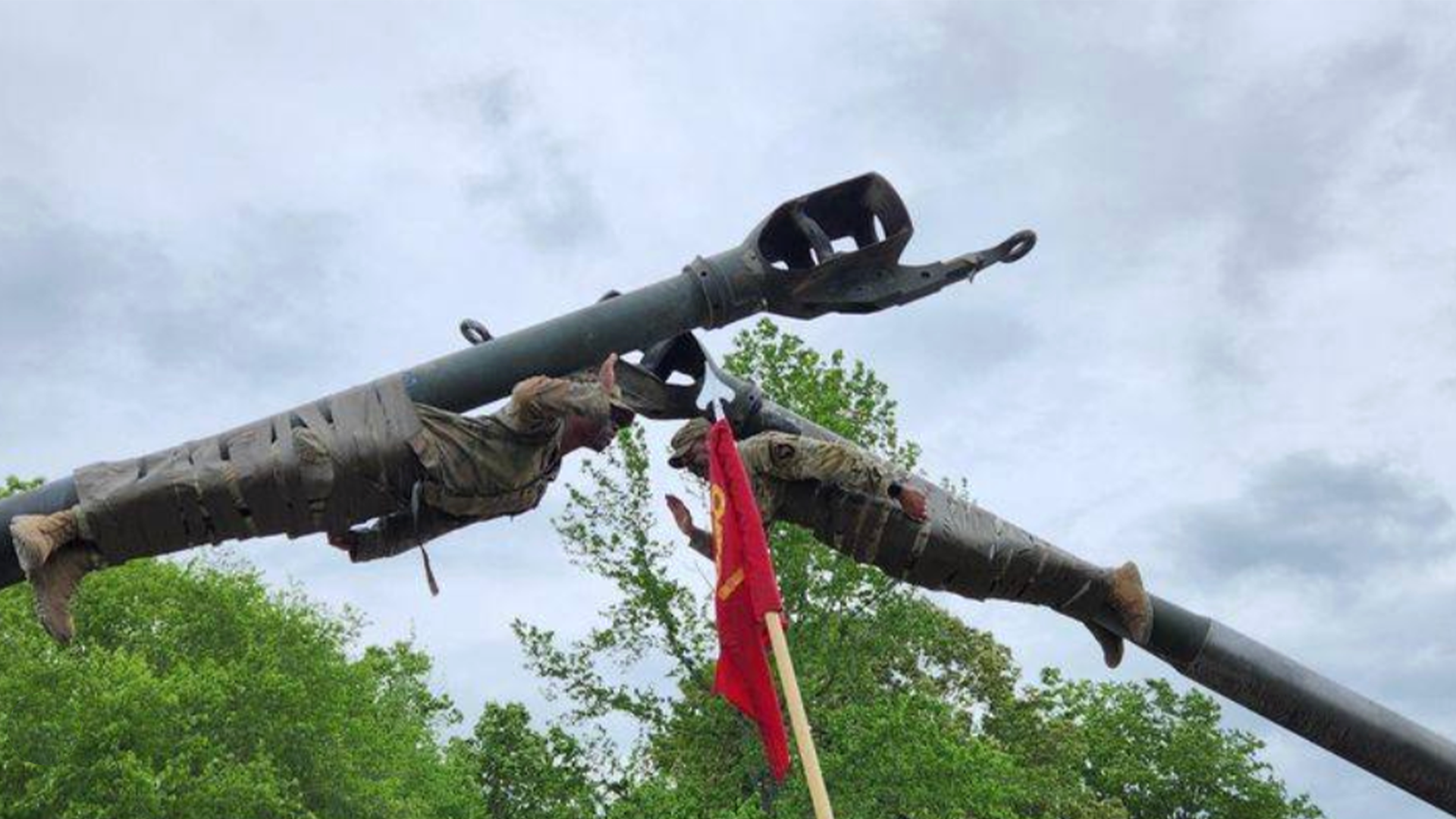The two photos show a pair of 101st Airborne soldiers, a specialist and his battery commander, taped to 155mm M777 Howitzer gun tubes as the oath of enlistment is administered above their fellow soldiers. Normally, when a service member is taped to something like this it’s considered hazing, but in this case, it’s a sign of a motivated soldier and an officer willing to go above and beyond for their troops.