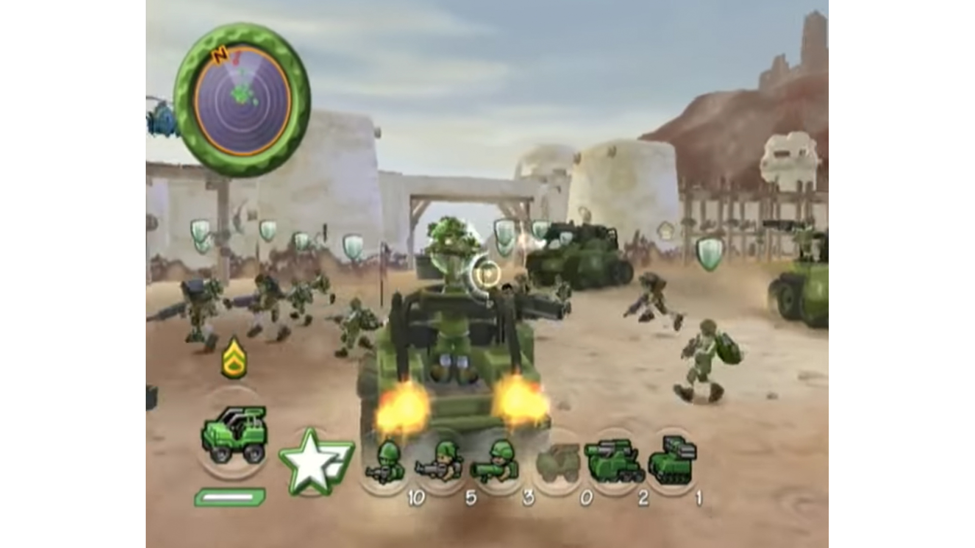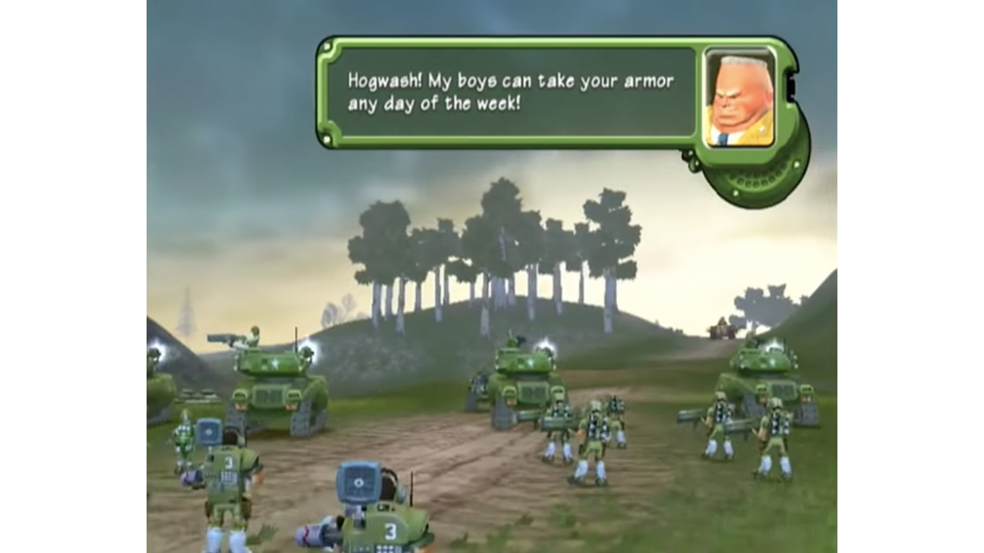 Besides the unique gameplay, what sets Battalion Wars apart is its art style. Most shooters I know of aim for a gritty, realistic feel in their look and storytelling. Battalion Wars chucks that out the window in favor of a bouncy, cartoon mood that never takes itself too seriously. Enhancing that cartoon feel is a colorful cast of commanding officers, including a beard-stroking Tsar Gorgi, a monocle-wearing Kaiser Vlad, and a plaid-suited General Herman who I think bears a slight resemblance to Chairman of the Joint Chiefs of Staff Gen. Mark Milley.