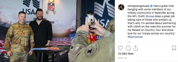 In 2009, Young traveled to Iraq, Kuwait, and Germany with fellow country artist Craig Morgan for Stars For Stripes, an organization that provides entertainment for troops overseas; in 2013, Young raised over $30,000 for Stars For Stripes, and he partnered with Crown Royal a few years later for a fan giveaway, which included Crown Royal donating $10,000 to Stars For Stripes. And in April this year, a month before his tour kicked off, Young performed at a NFL Draft USAA Salute to Service event for service members at Fort Campbell.