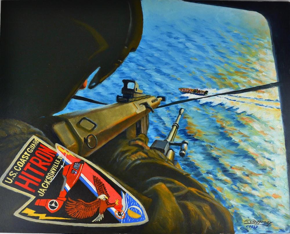 Frank Gaffney’s “Stopping a go-fast” is an in-the-moment painting of the Helicopter Interdiction Tactical Squadron flying over a drug smuggling boat, with the viewer’s eyes almost in line with the sights of the Coast Guardsman’s gun.