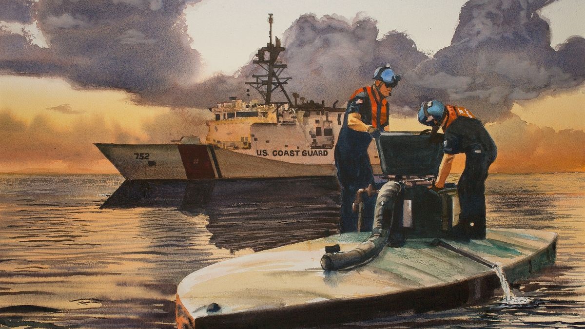 The painting, by Charles Van Horn, depicts in watercolors a July 18 operation by the USCGS Stratton. The ship, a long-range cutter that was on a four-month mission, spotted a “semi-submersible” vessel. The 40-foot-long drug vessel was essentially skimming along the surface of the water, part of it above the waves while traveling toward the United States. The Stratton was able to spot it and reach it in the open seas. In Van Horn’s painting, two Coast Guardsmen stand on top of the submersible, unloading the stored cocaine. The watercolors give the painting a softer touch, although the artist has a very realistic style. The submersible was loaded with 16,000 pounds of cocaine and the Stratton’s crew was able to get 12,000 off the vessel before it sank.