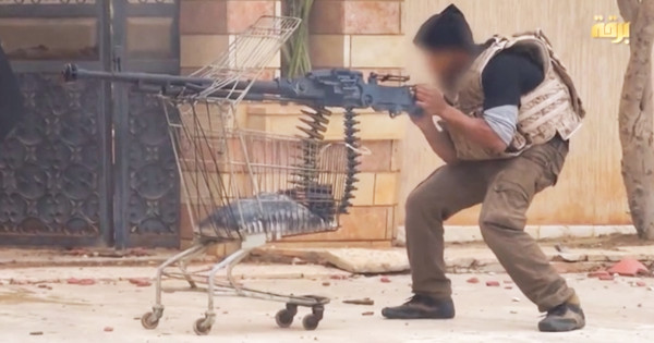 That’s certainly a step up from the spray and pray over walls tactic that is often employed by jihadists. Not only does this combat cart provide some stability for the gun — which seems to be a Soviet DShK heavy machine gun — it even holds a box of ammo. Innovation!