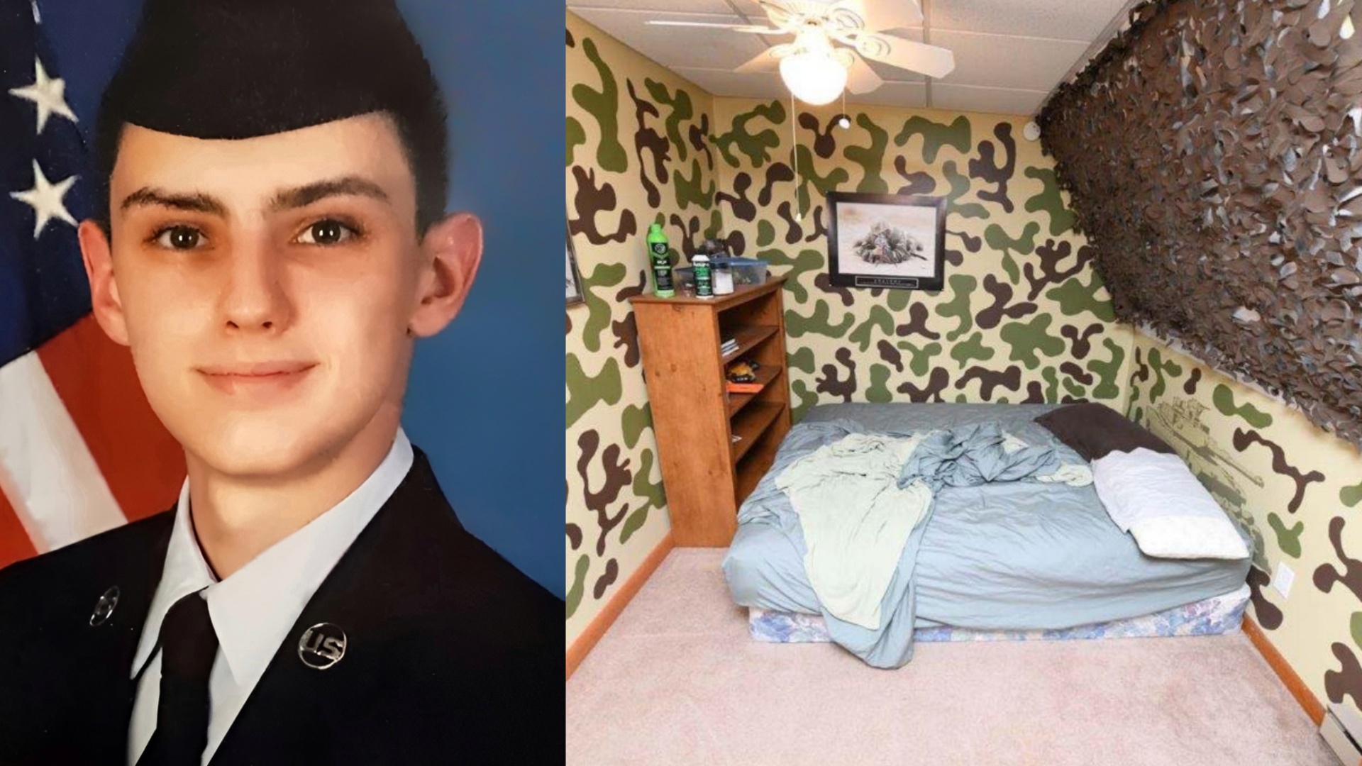 A home arsenal while living in mom’s basement and leaking sensitive intelligence is one thing, but, well, the bedroom itself is painted in camouflage patterns. And we can’t not say something about that.