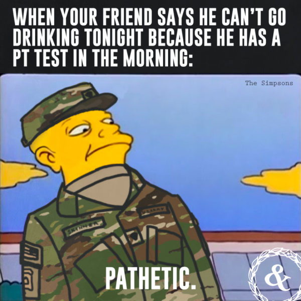 A little liver Olympics with a side of self-loathing helps smooth out the worst of it, and sometimes you’ll run across friends that won’t want to take part as much as you. In time, they too will see the folly in giving a shit about things like PT tests and ‘being sober’. Until then, you’re well within your right to ridicule them until they are wading deep into the dependa watering holes you typically find yourself in on a Tuesday night.