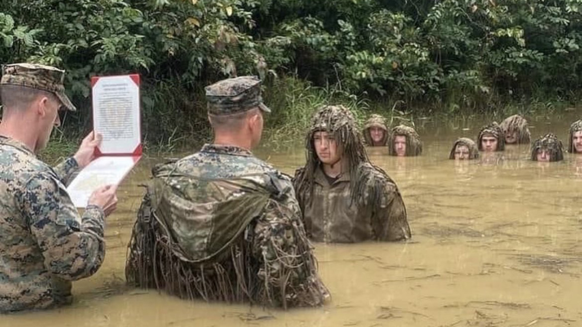 A picture shared on social media shows Sgt. Jordan James being promoted to his current rank while stoically standing chest deep in chocolate brown water. James is currently the chief scout with Scout Sniper Platoon, Weapons Company, 3rd Battalion, 3rd Marines, said Master Sgt. Matt Epright, a spokesman for the 3rd Marine Division. As chief scout, James serves as a platoon sergeant and an expert on many of the platoon’s tactics, techniques and procedures.