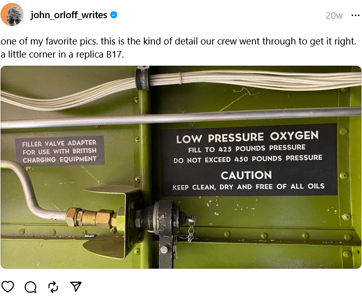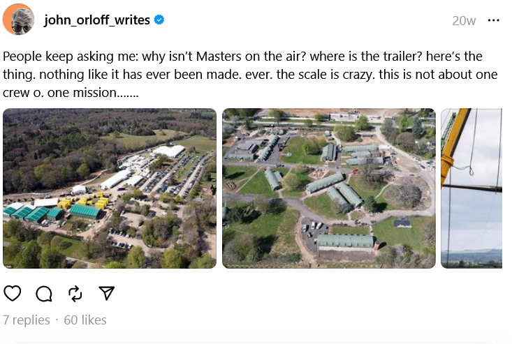 Orloff, who also wrote two episodes of Band of Brothers, posted on Instagram and Threads several looks at the production. According to one post on Threads, the production is “kinda like four movies….” and he’s been working on it for a decade. That involved extensive research. Online, Orloff has posted some real-life history of the 100th Bombardment Group alongside details from the show, including photos of the real-life pilots and the story of an Aug. 17, 1943 bombing raid. 21 B-17s took off for the mission, with only 12 returning.