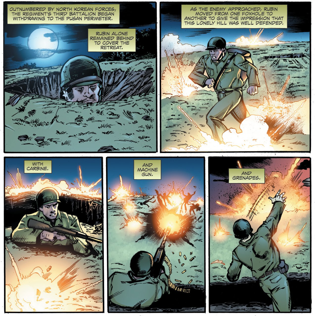 While near Pusan in South Korea, his company was ordered to retreat in the face of an overwhelming enemy assault. Rubin alone stayed behind to buy time for his fellow soldiers to withdraw.