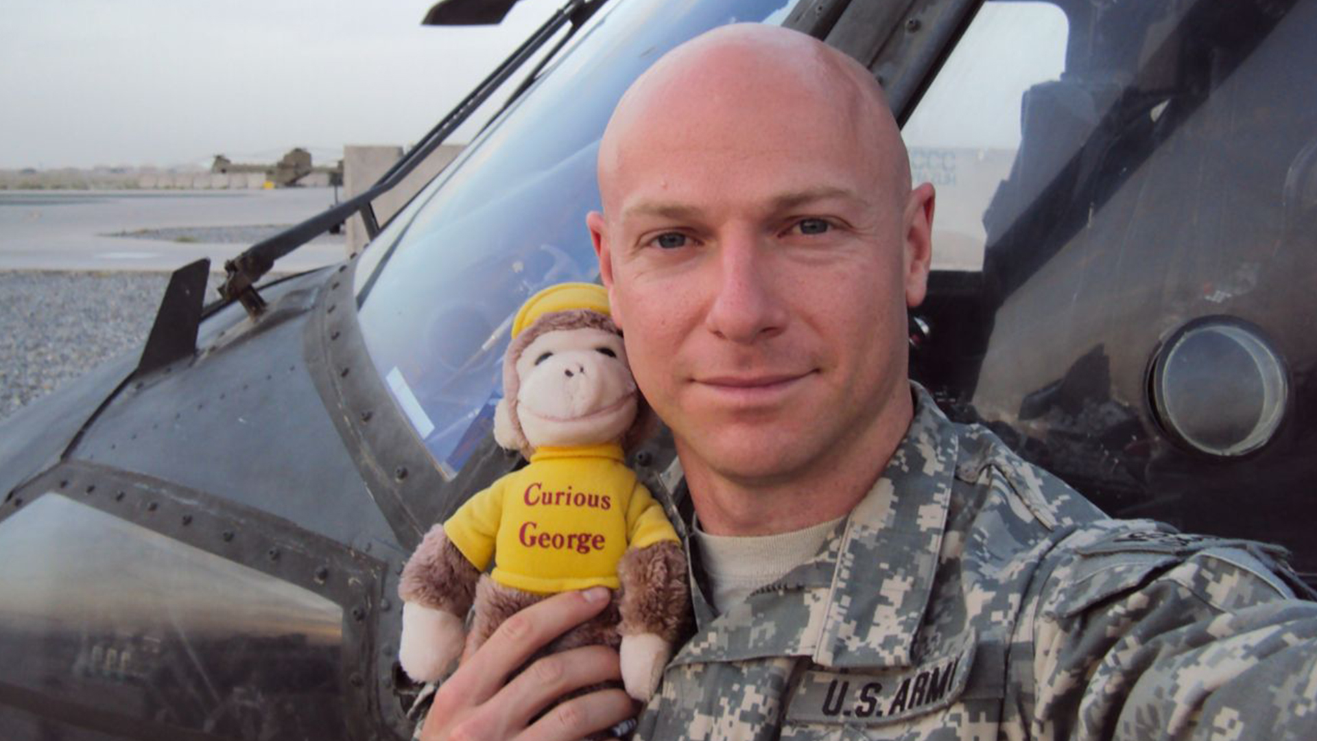 The purple gorilla wasn’t the only stuffed monkey flying in a U.S. Army helicopter over Afghanistan. Col. Jason Davis (then a captain) saw the movie Curious George with his daughter right before he deployed. It was the first movie she ever saw in theaters, so it was curious indeed when Davis found a stuffed animal version of the monkey in a box left behind in his predecessor’s office when he took over in Bagram in 2006.