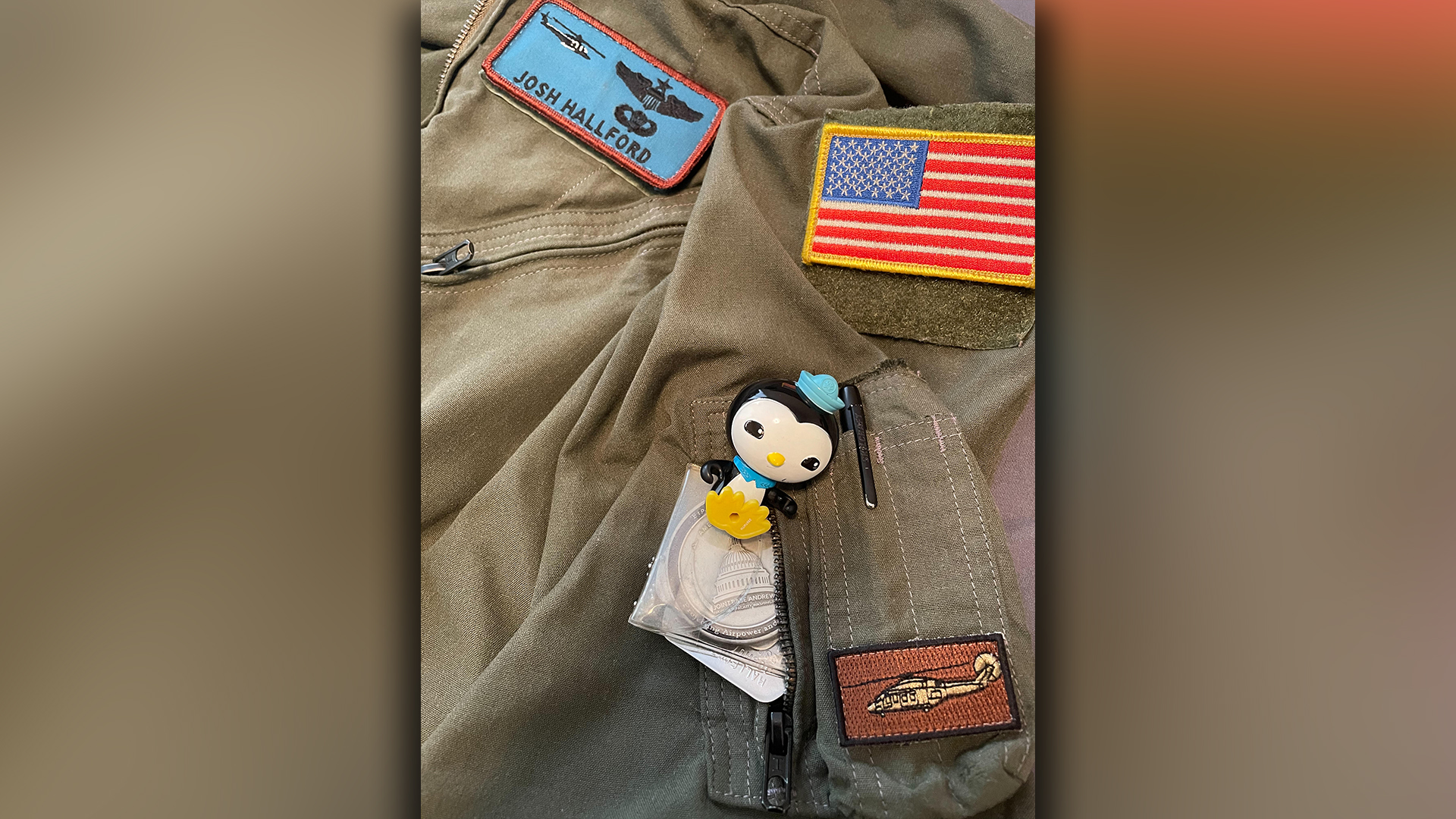 Maj. Josh “Bowser” Hallford flies helicopters for the Air Force, but when he’s at home with his five-and-a-half year old son Logan, they watch a TV show called Octonauts together. The show is about a group of undersea explorers who go on adventures together, and one of Logan’s favorite characters is Peso, a penguin who serves as the team’s medic. It meant a lot, then, when Logan gave his dad a key-chain-sized Peso toy to take with him on the job.