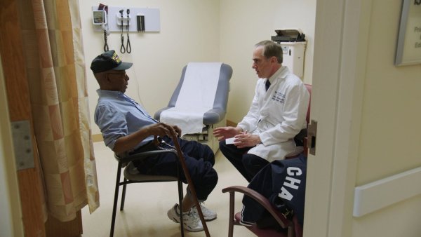 Dr. David Shulkin, Secretary of the U.S. Department of Veterans Affairs, speaks with a patient at the VA hospital in New York City.Steeplechase Films