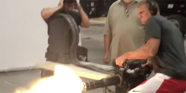 Why yes, that is Bill Belichick’s prime non-Ugg-wearing investment, wielding — dare we say loving? — a rotary cannon, probably the 7.62mm NATO M134 Minigun of Predator fame, hot brass clanging between his legs as he spews hot death from all 22 inches of his barrel.