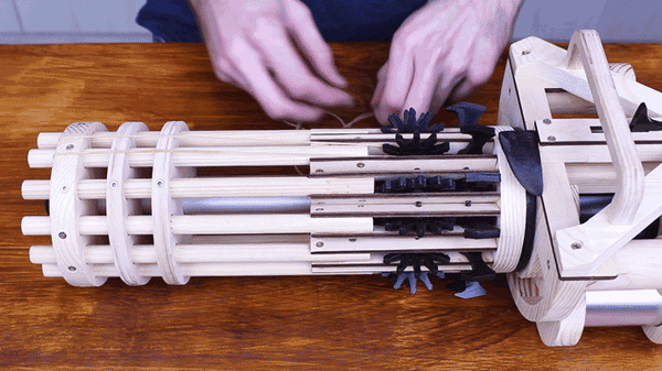 The fully-automatic Rubber Band Minigun is made almost out of wood (though it also comes painted in solid black) and fires at speeds of 200 rubber bands a minute thanks to its electric motor.