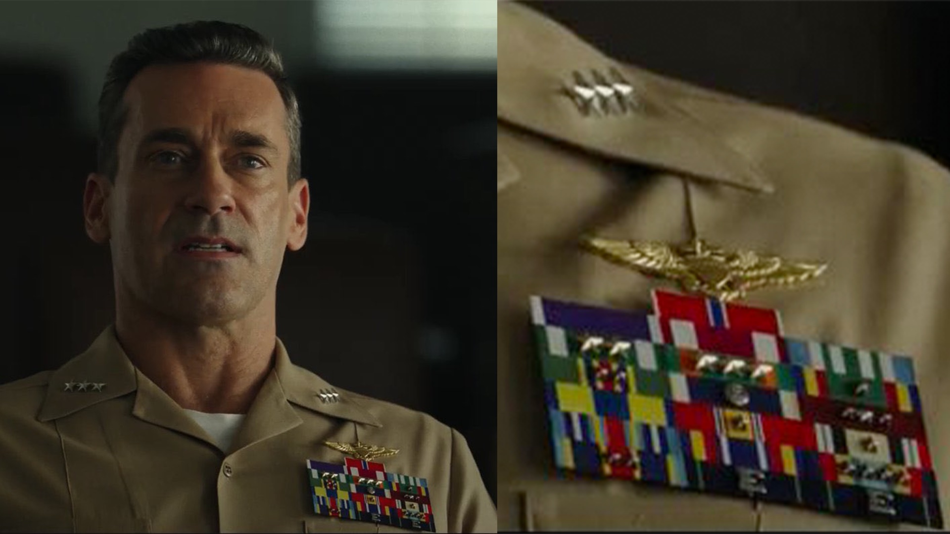 Jon Hamm’s Vice Admiral with the callsign “Cyclone” certainly appears to have had an interesting career. With three stars on his Good Conduct Medal, Cyclone appears to have served between 12 and 16 years as an enlisted sailor before commissioning. Only enlisted sailors are eligible for the medal and each star denotes an additional award. Given Cyclone’s rank and what it suggests about the length of his career, he was likely an enlisted sailor in the Navy before 1996, back when the award required four years of continuous service, unlike today, which requires three years. On top of all that, he managed to achieve the rank of Vice Admiral, while still looking like Jon Hamm.
