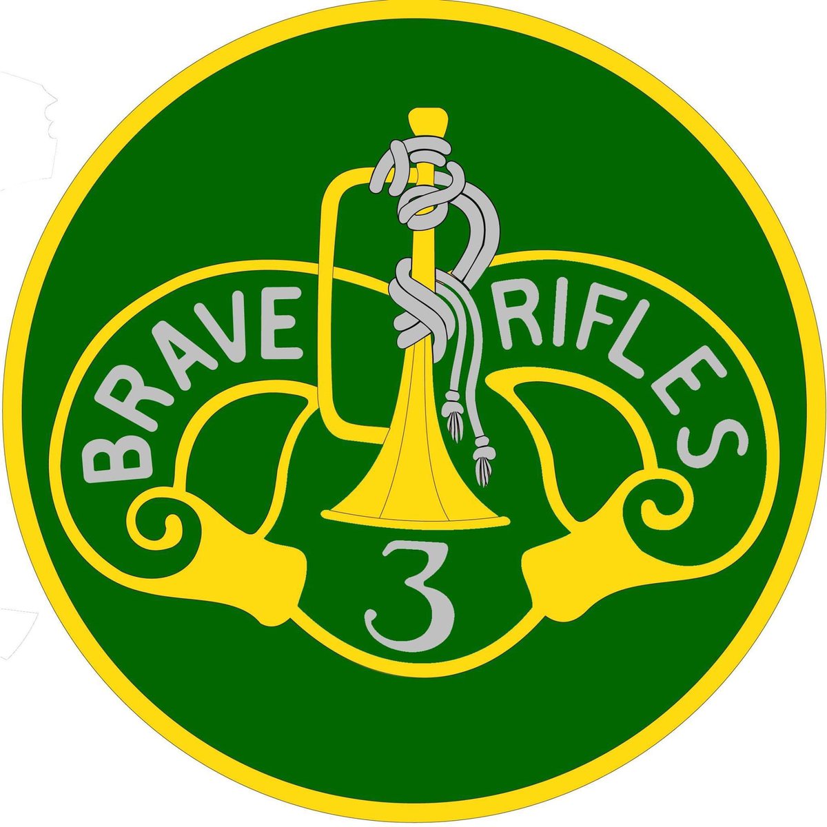 The trumpet, or hunter’s horn, was the traditional, universal symbol of all mounted infantry regiments in Western armies and represents the Regiment’s original designation. The inscription, “3 Brave Rifles,” is the Regiment’s number and motto.