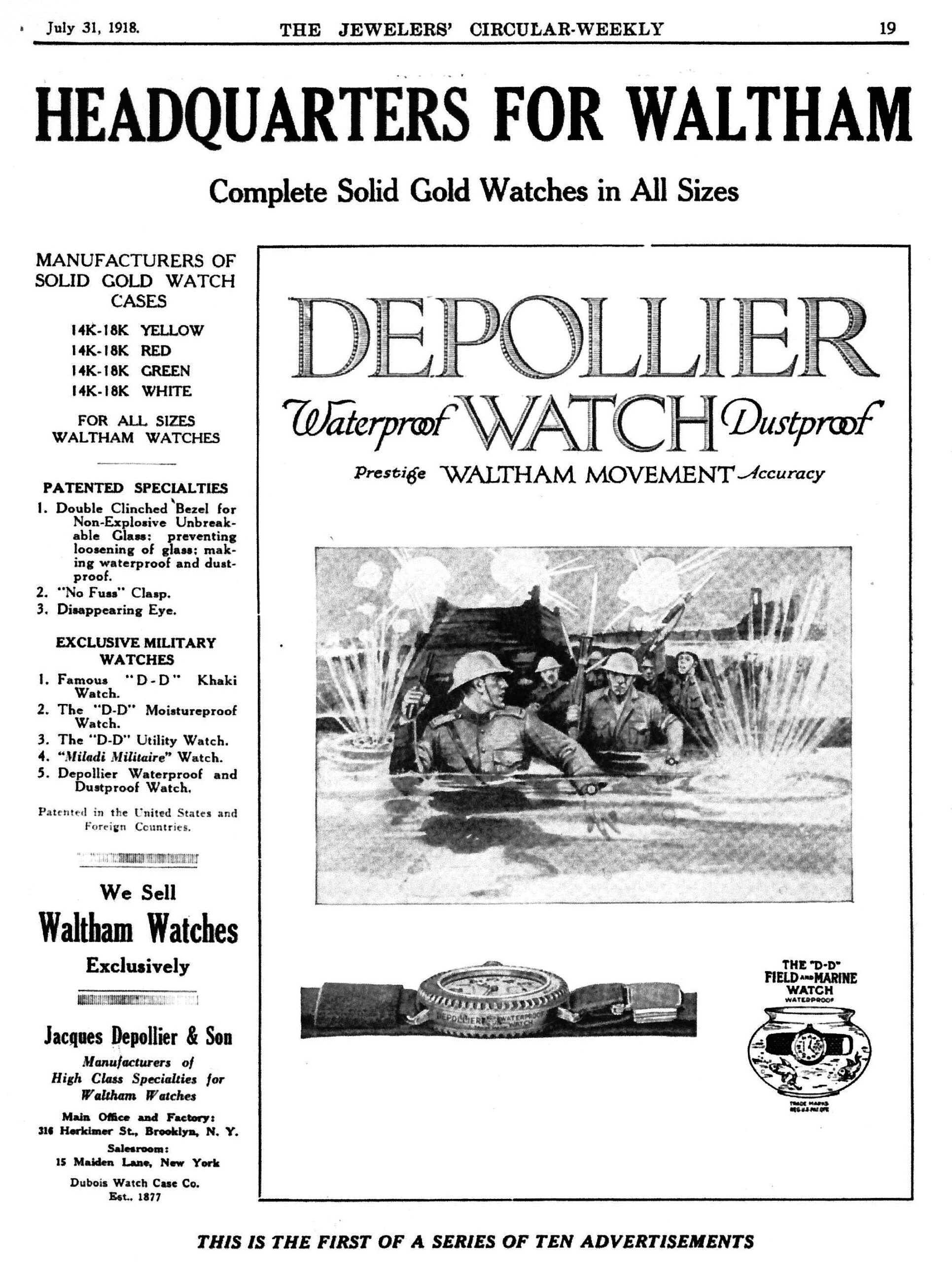 “In 1916 the wristwatch used was very basic but by the time the war was nearing its end the Americans, specifically Charles Depollier of J. Depollier & Son, had perfected the waterproof wristwatch,” Czubernat said. “Depollier worked hand in hand with Lieutenant Colonel Mauborgne’s team at the Engineering & Research Division to produce the world’s first waterproof wristwatch specification in late 1918.”