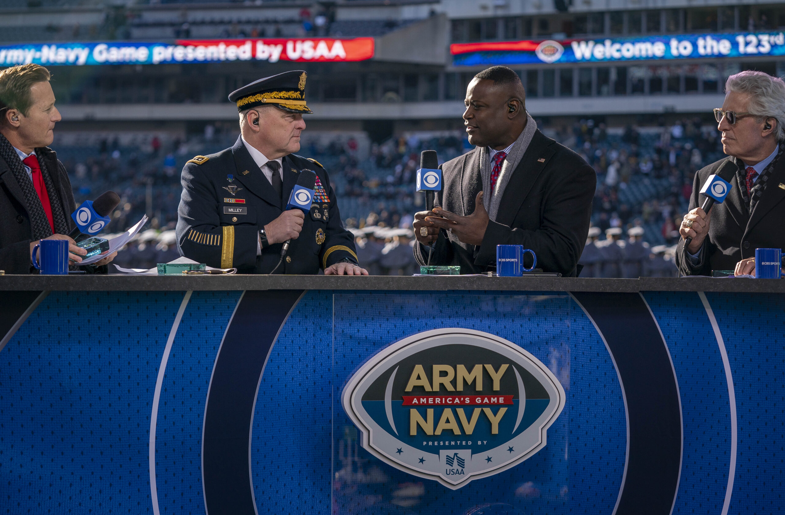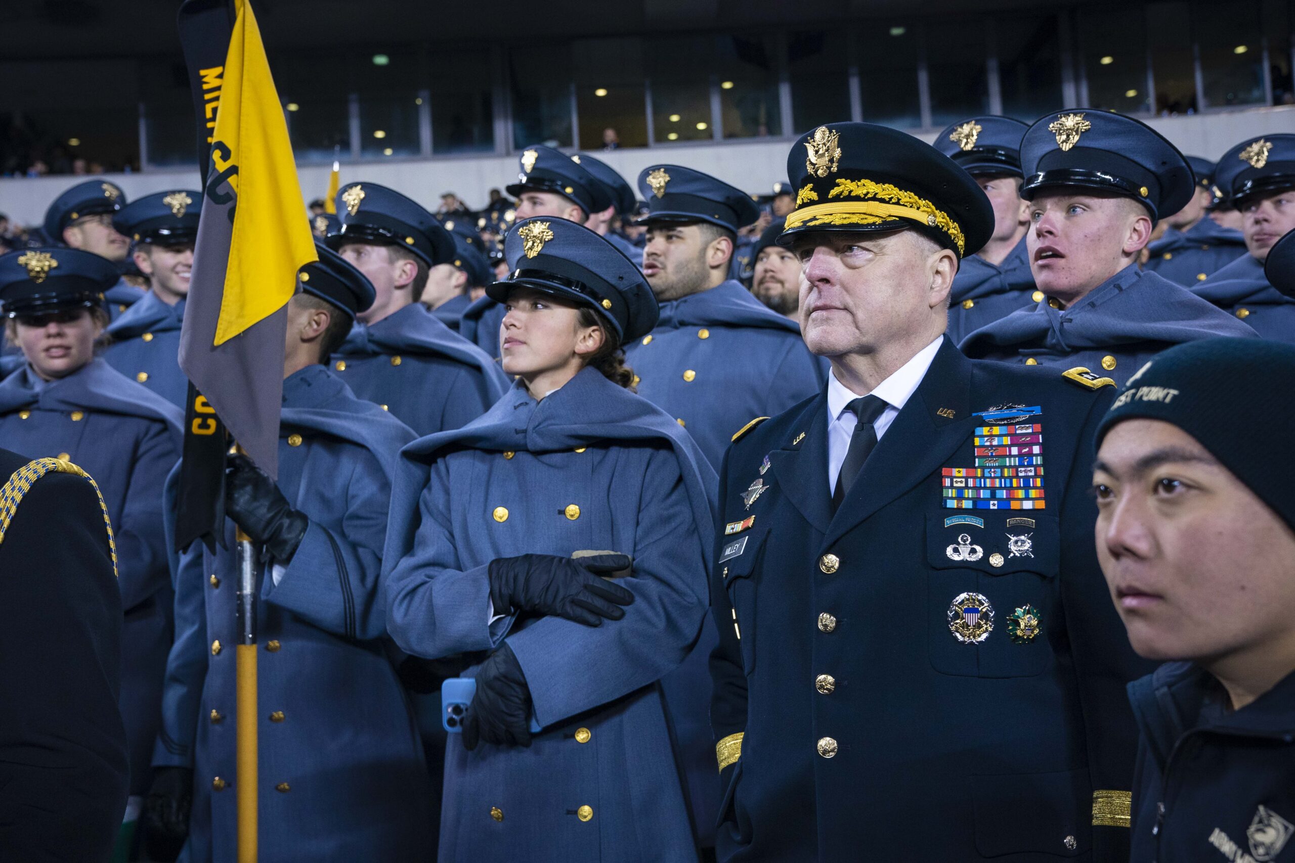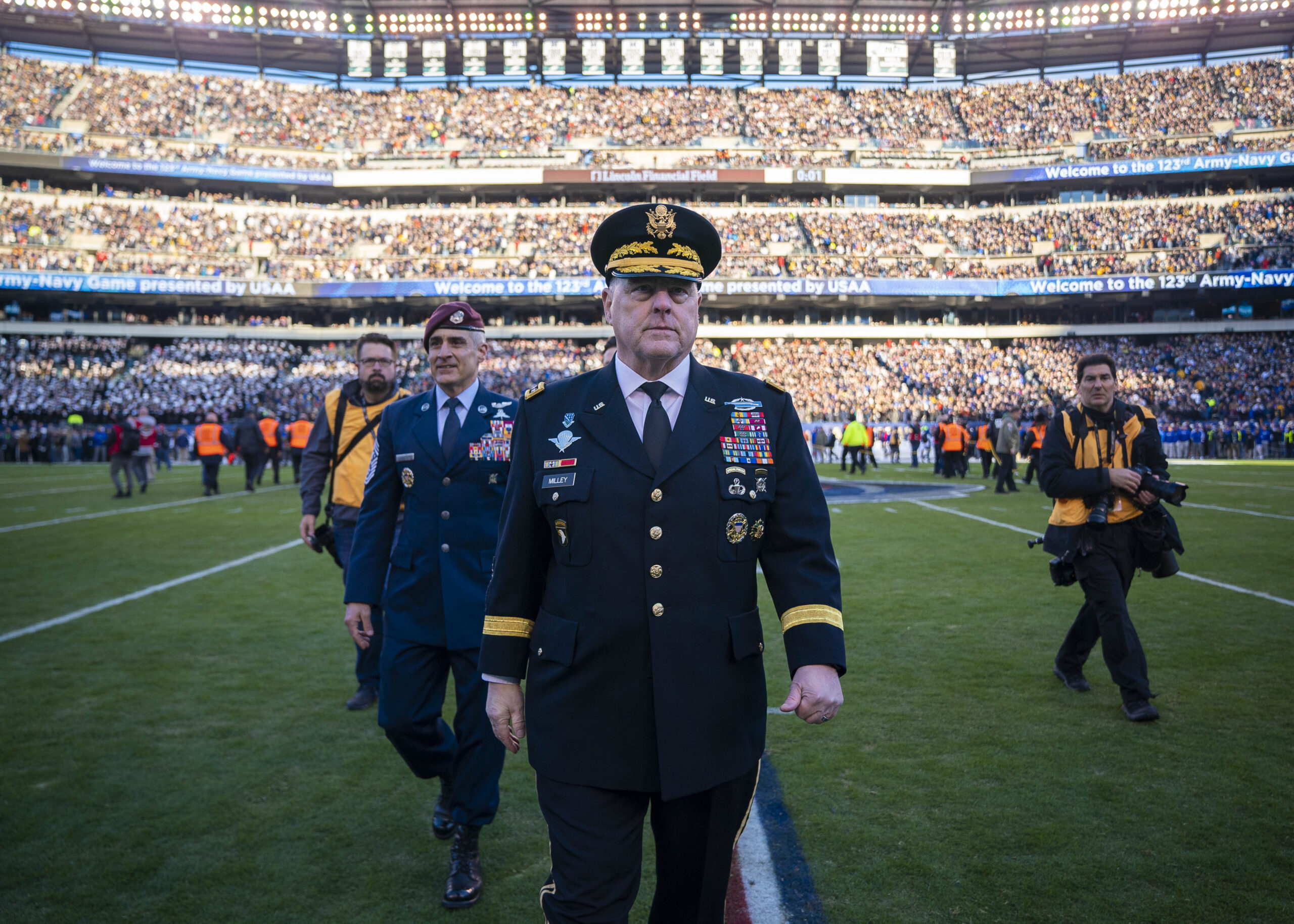 A short while later, after the pre-game festivities had wrapped up — the West Point cadets and Naval Academy midshipmen had marched around the field, the Army and Navy’s parachute teams had sailed through the skies and landed neatly on the gridiron, and the final verses of the National Anthem belted out by the crowd, Milley took to the sidelines to watch his seventh Army-Navy game in a row.