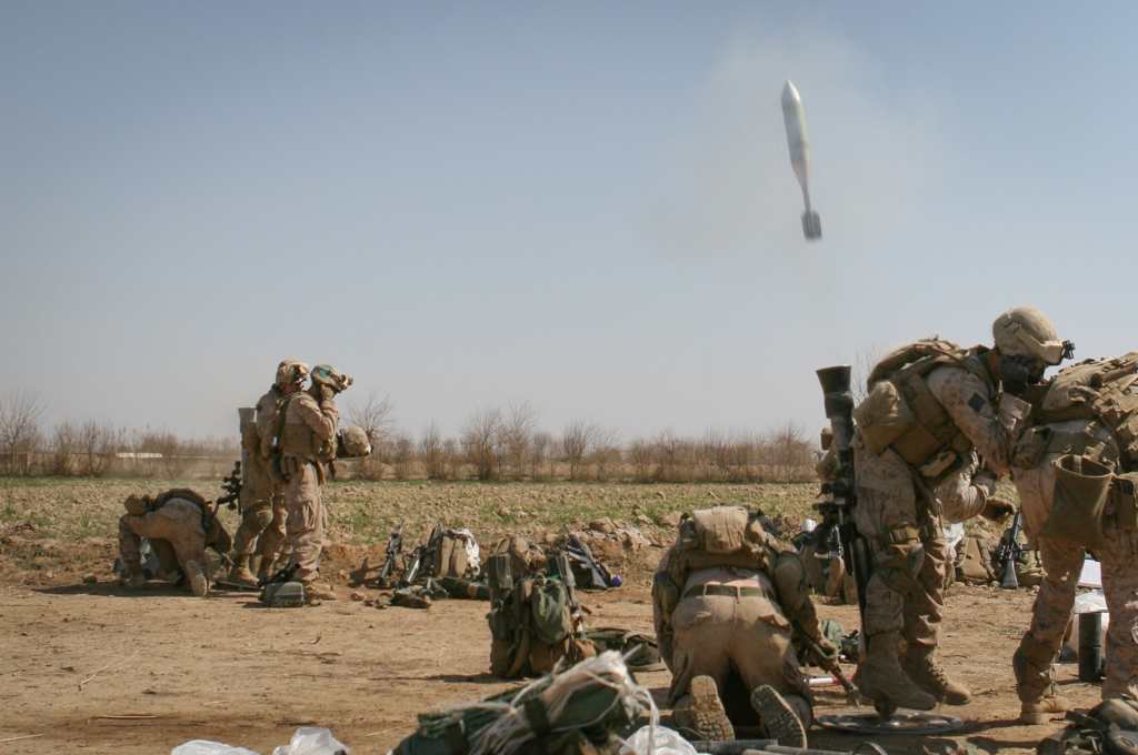 The ensuing moments — Marines sprinting to cover, or diving onto the dirt, as mortarmen fired rounds at a cluster of buildings — were photographed and later shared far and wide online, in print, and appeared as brief snippets during evening broadcasts on cable news.