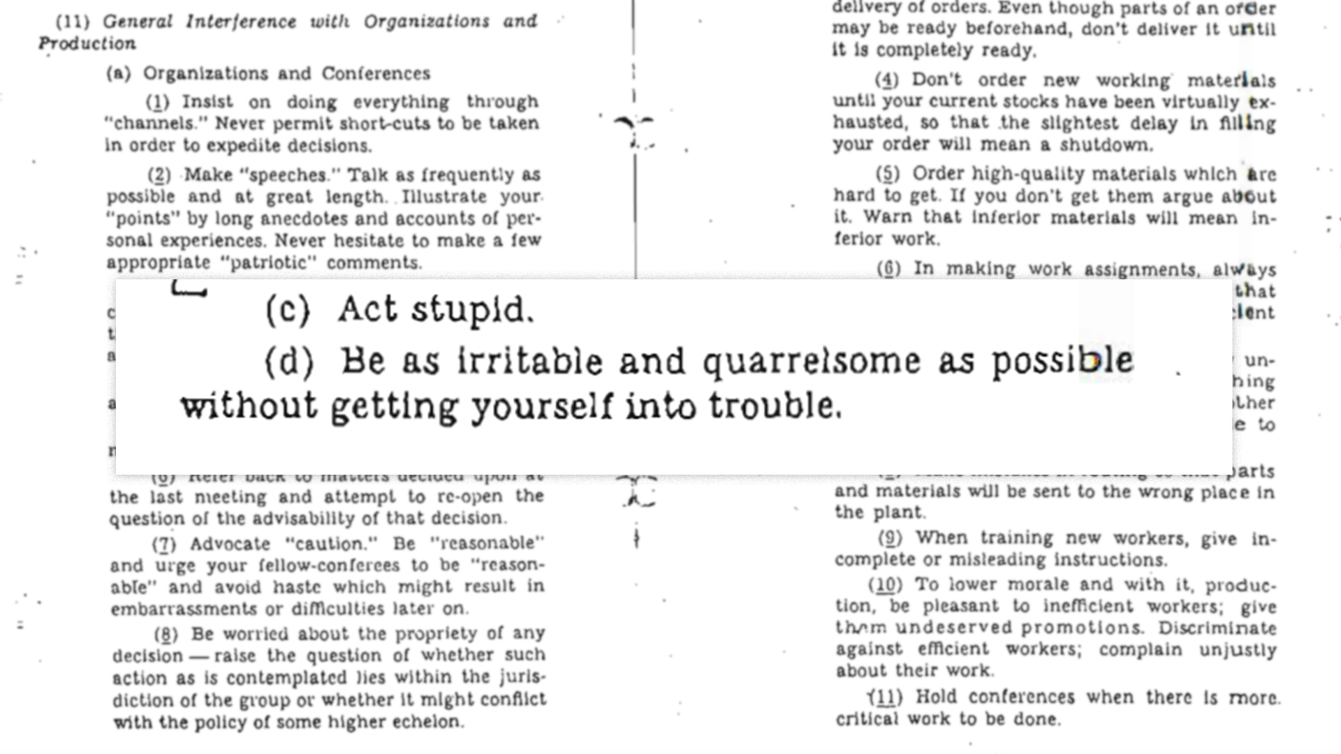 During World War II, the Office of Strategic Services (OSS) was manned with thousands of soldiers and spies, operating behind enemy lines to organize local resistance, gather intelligence and generally cause chaos for the enemy in occupied Europe. But as one OSS manual shows, sabotage isn’t always about blowing up railways or severing communication lines. Sometimes it’s as simple as being the absolute worst employee possible for your Nazi occupiers.