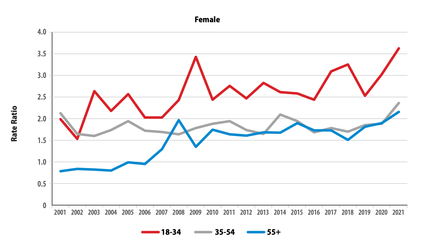 From the VA’s annual suicide report for 2023. The chart indicates the rate of suicide among women veterans of different age groups versus women with no military ties. In 2021 (far right), women veterans 18 to 34 (red line) spiked to over 3.5, meaning veteran women in that age group were 3.5 times more likely to die by suicide than their civilian peers, a record high.