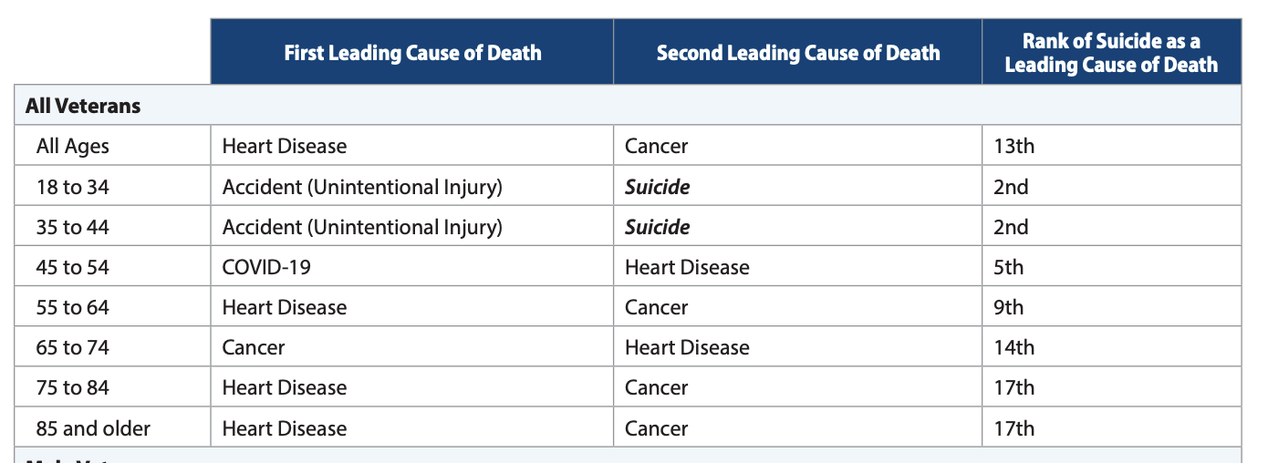 As young women veterans saw a spike, so did the rest of the veteran community, the VA found, after two years of decreasing rates. In 2021, 6,392 Veterans died by suicide, an increase of 114 suicides from the previous year. Overall, suicide was the 2nd leading cause of death for veterans between 18 and 34 years old, the VA found, trailing only accidents. Suicide was the fifth leading cause of death for veterans ages 45 to 54.