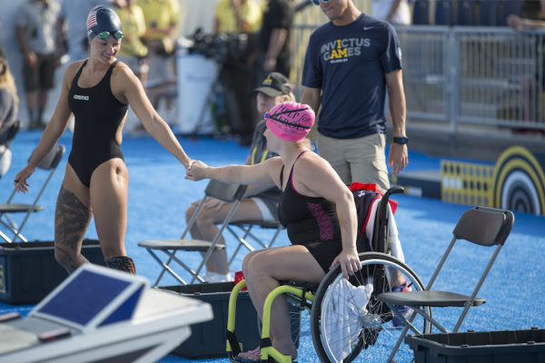 Elizabeth Marks, United States, left, wishes Anna Pollock, right, good luck before they compete in the 50 Meter Backstroke event during the 2016 Invictus Games, ESPN Wide World of Sports Complex, Orlando, Fla., May 11, 2016.