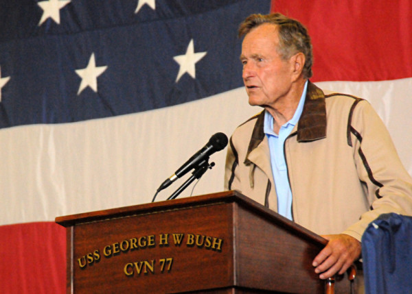 Former President George H.W. Bush speaks to the crew of the aircraft carrier USS George H.W. Bush in the ship’s hangar bay on July 15, 2010.U.S. Navy photo by Petty Officer 3rd Class Brent Thacker