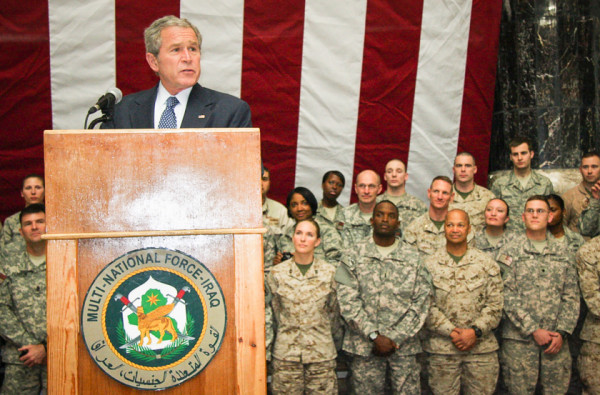 Soldiers, airmen, sailors, and Marines listen intently as then-President George W. Bush thanks the assembled service members who gathered at the Al Faw Palace for the opportunity to hear from their commander in chief, Dec. 14, 2008.Department of Defense photo