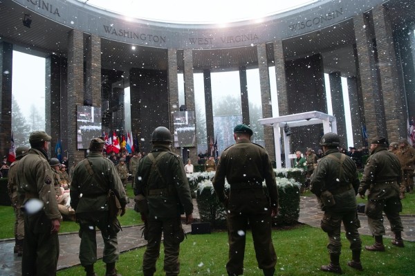 World War II reenactors and a simulated snow shower are part of the ceremony for the 75th anniversary of the Battle of the Bulge, at the Mardasson Memorial, Bastogne, Belgium, Dec. 16, 2019 (DOD, Lisa Ferdinando)