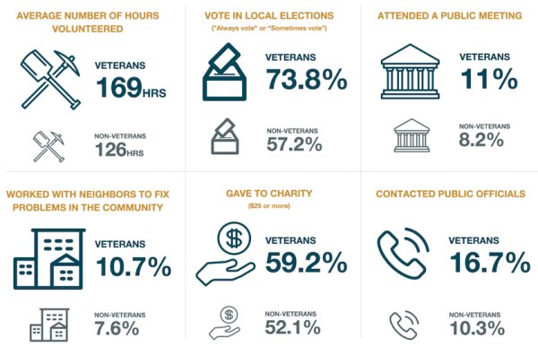The findings are reassuring for those who believe that military service turns young men and women into valuable contributors to society. Across a number of metrics — volunteerism, voting, charitable giving and community involvement — veterans of all generations tend to be more involved and more generous than non-veterans, even if not always overwhelmingly so. Clearly, veterans care, and communities benefit because of the lessons that military service teaches and the values it instills.