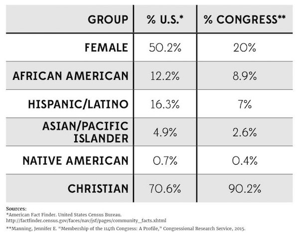 Congress has certainly made progress toward diversity in recent decades, but the fact remains that our legislators simply do not look like America. For starters, women outnumber men in America, yet only have a 20% representation in Congress. Racial minorities including African Americans, Hispanics, Asians, and Native Americans hold only about half as many congressional seats as their representative shares of the population. Over 90% of Congress associates with a Christian faith, while Christians account for only 71% of Americans. The stats go on and on.