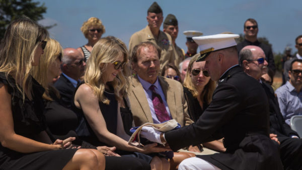 Lt. Col. Wade Workman presents the flag of Maj. R. Sterling Norton, a fallen pilot with Marine Fighter Attack Squadron (VMFA) 232, to his wife during his funeral ceremony at the Miramar National Cemetery, San Diego, August 12, 2016.U.S. Marine Corps/Sgt. Lillian Stephens