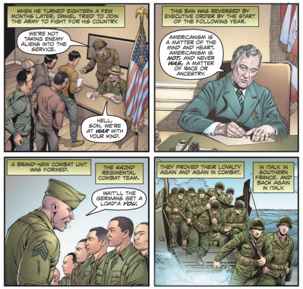 “I was so pleased to be able to tell the senator’s story and describe part of the history of the 442nd,” said Chuck Dixon (Batman, The Punisher, The ‘Nam), who wrote the script for the graphic novel.