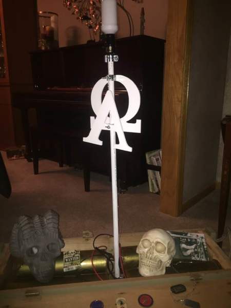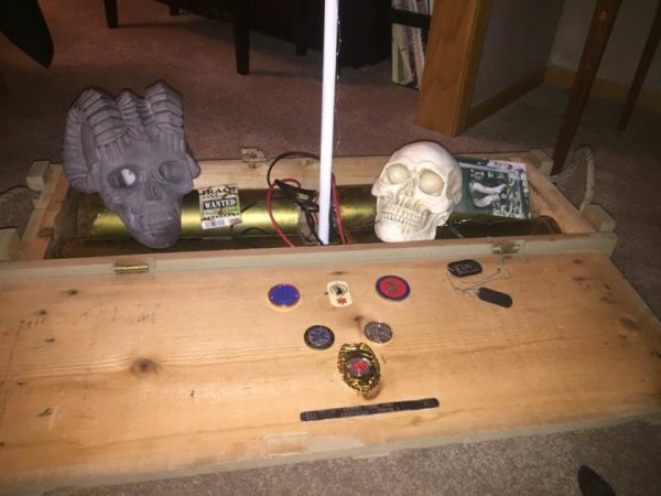 The sculpture has the four 155 mm casings, wired together inside a wooden crate, with two fake skulls, a deck of cards, his dog tags, and various symbolic medals and coins. A flickering light bulb projects up from the box. It is meant to show the light that helped him through his darkness. After obtaining the materials on the internet, it took him about a month to assemble the piece.