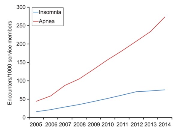 Cases of obstructive sleep apnea — blockages in the upper airway that affect breathing — have seen a five-fold increase, rising from 44 cases in every 1,000 troops in 2005 to 273 in every 1,000 in 2014, a 517% jump.