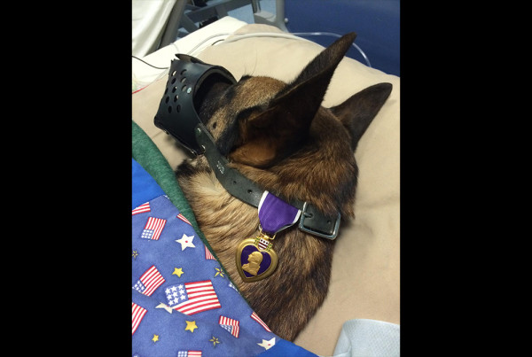 “The Army typically does not process awards for our working dogs the same way we do for our other soldiers,” wrote Sgt. 1st Class Michael Garrett, 89th Military Police Brigade public affairs officer in an email to the Killeen Daily Herald. “The Purple Heart in the photo was placed on Rocky as a sign of respect and solidarity between him and Brown during their recovery.”