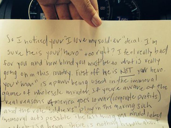 Wilson boasts a decal on her car that reads, “I love my soldier.” Well, apparently, someone took offense to that and took the time write her a terrible note rife with conspiracy theories about war and hatred for people in uniform.