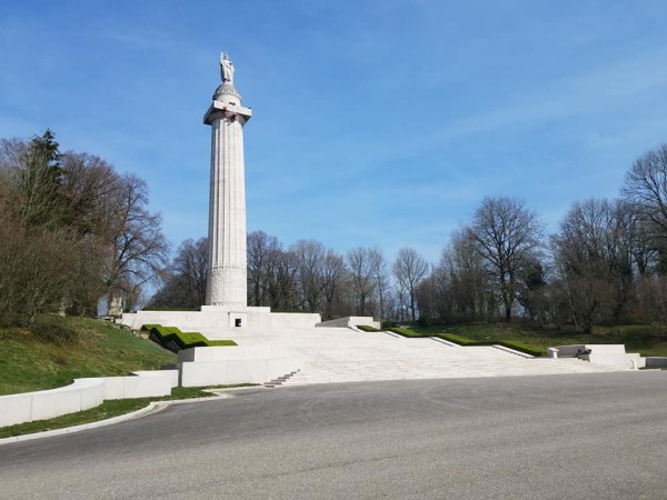 We drove through a sleepy and deserted Montfaucon-d’Argonne built carefully as a facsimile of a centuries-old town, with a cafe, bakery, and cathedral prominent. In a small town park, a monument to Pershing and an American tank with a white painted star stood watch. White arrows pointed us up the only hill in view, toward the Memorial Americain.