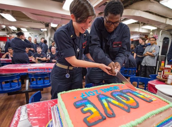 Ensign Casey Roy and Seaman Jada Ellis cut the cake during the LGBT Pride Month celebration aboard the forward-deployed Arleigh Burke-class guided-missile destroyer USS McCampbell (DDG 85).