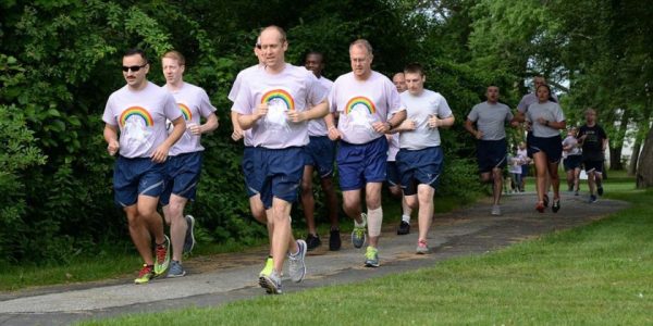 Hanscom AFB personnel participate in a 5K Rainbow Run on base June 29. Hanscom’s Lesbian, Gay, Bisexual and Transgender Pride Month Committee hosted the run as part of their events during June to raise awareness and increase understanding of the LGBT community, and more than 100 people participated.