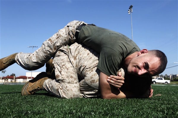 Marine Corps Staff Sgt. Jeremy Meadows holds a Marine in a headlock while grappling at Marine Corps Air Station Miramar, Calif., April 22, 2013. A martial arts instructor trainer, Meadows is one of only a few second-degree black belts assigned to the air station.