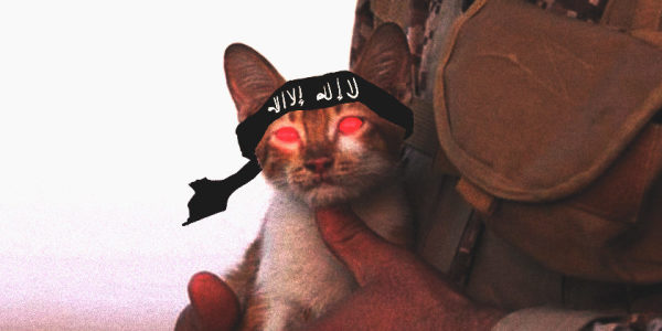 Imagine you’re a kitten living in war-torn Syria. You’re cold and hungry. It’s been days since you’ve had a mouse or a bowl of milk. Then, one morning, you’re approached by a bearded man in body armor. He beckons you. “Come,” he says. So you go. Maybe he has food. You crawl into the man’s arms and someone snaps a photo. Three years later, your image appears in the glossy pages of Dabiq, a periodical magazine produced by the Islamic State to recruit Westerners into its ranks. Congratulations. You’ve just become the whiskered face of global jihad.
