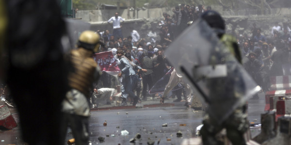 Afghan riot police equipped with body armor and shields were deployed to quell the protests, firing shots into the air and lobbing tear gas grenades at the crowd as it moved closer to the enormous blast crater, which is near the presidential palace. A running battle ensued. The chaotic scene was broadcast live on Afghan television.